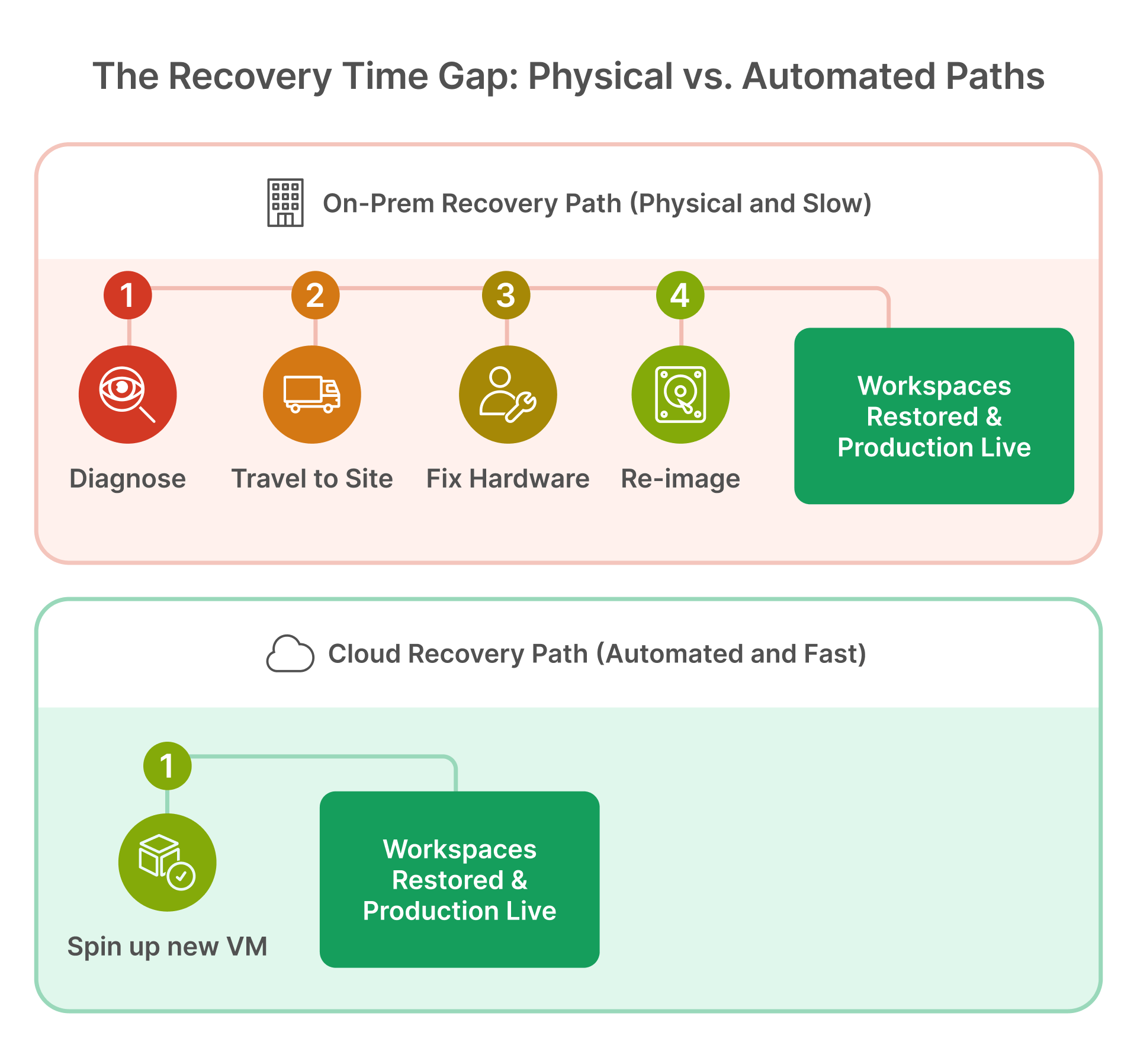 On-prem VDI doesn’t cause downtime—but it can make recovery slower when incidents hit local infrastructure, local identity systems, or when rebuilding requires site-specific steps.